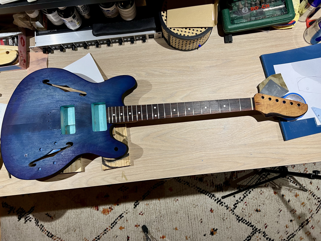- Application: Mouillez le chiffon ou la mèche dans le mélange et appliquez avec des mouvements longitudinaux (suivant le grain) ou circulaires (pour les retouches ou une plus grande intensité dans les petites zones). Répétez le processus jusqu’à obtenir l’intensité de couleur désirée. Avec cette méthode d’application, vous pouvez teindre uniformément une guitare ou créer des effets sunburst en superposant différentes couleurs directement sur le bois.